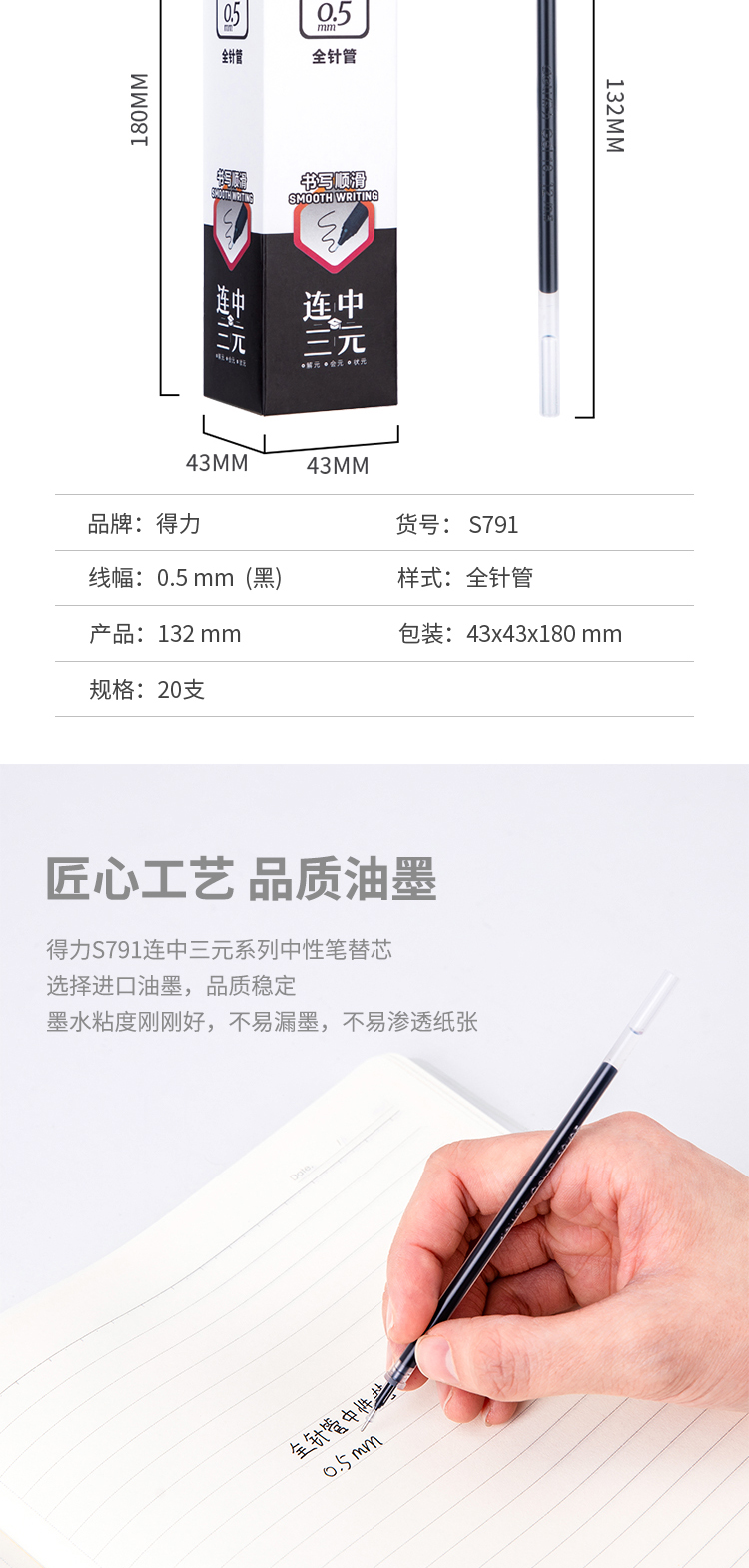 得力(deli)S791 全針管簽字筆芯 黑色中性筆芯 20支/盒