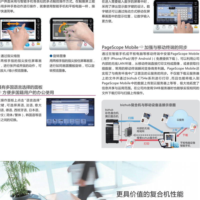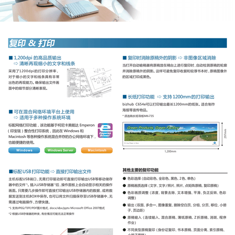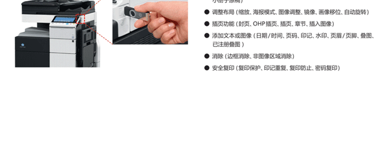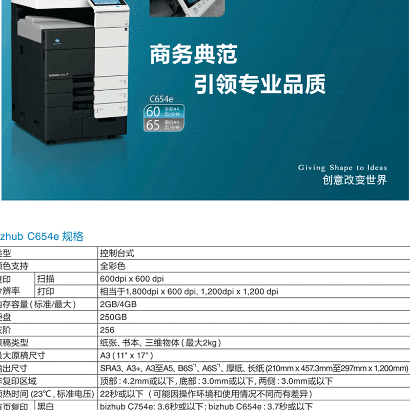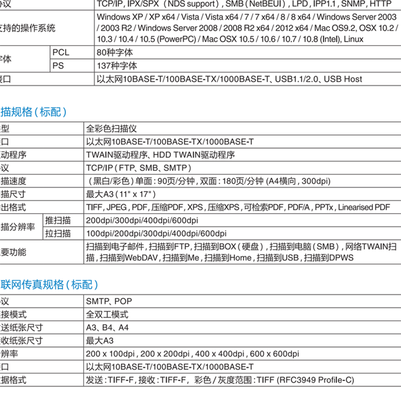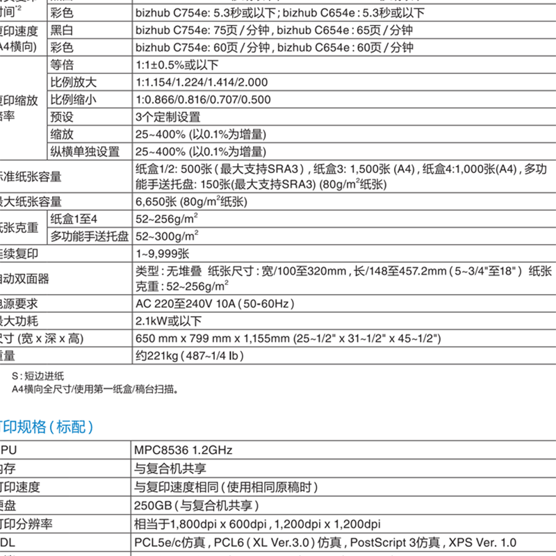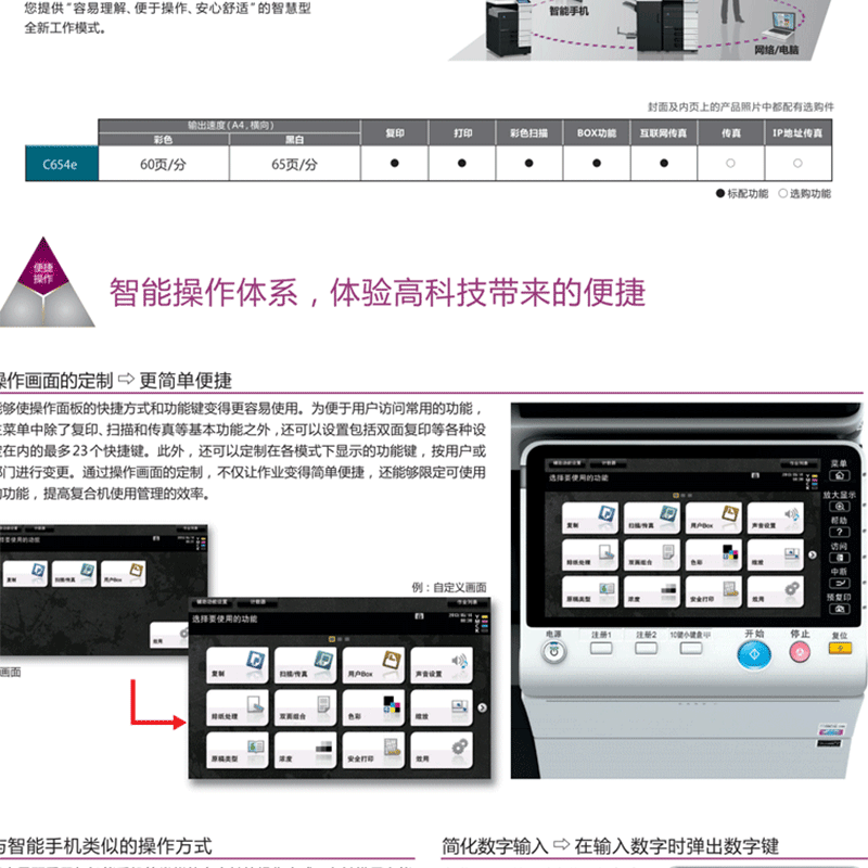 復印打印掃描標配互聯(lián)網(wǎng)傳真,彩色60頁/分鐘,黑白65頁/分鐘 標配自動雙面。 ?