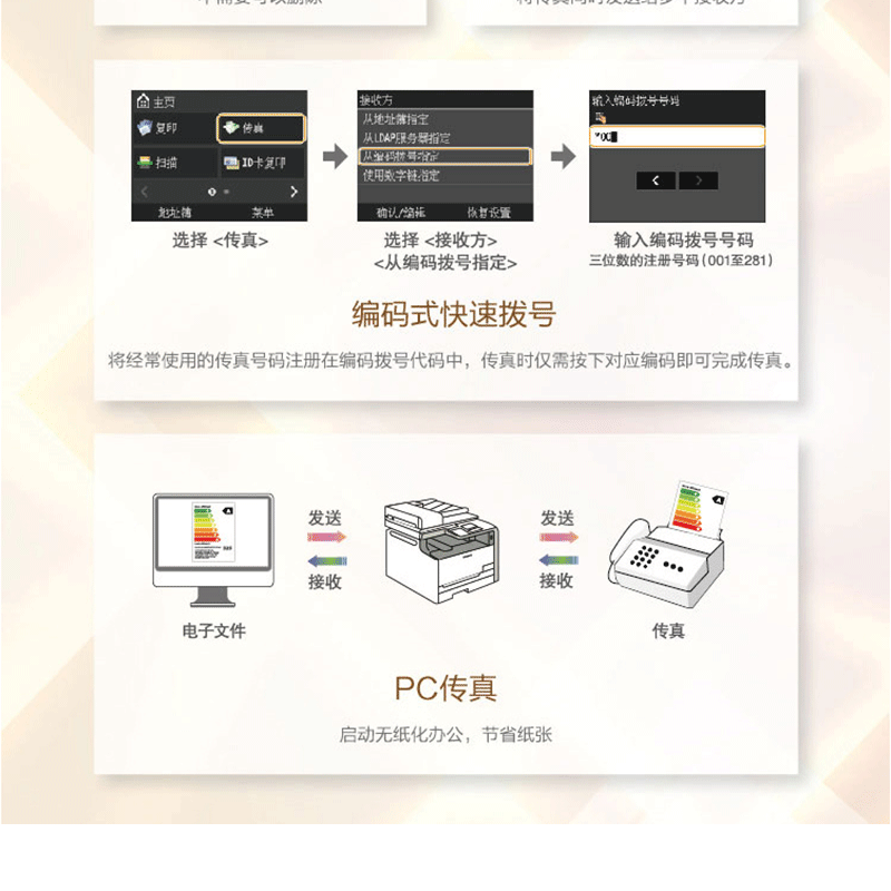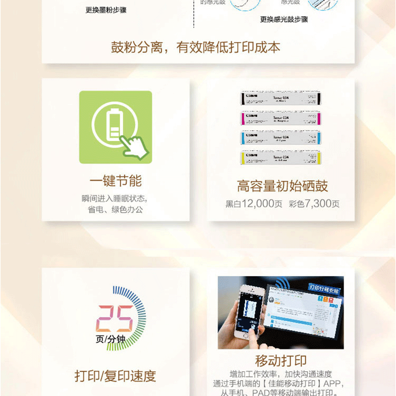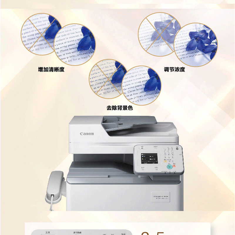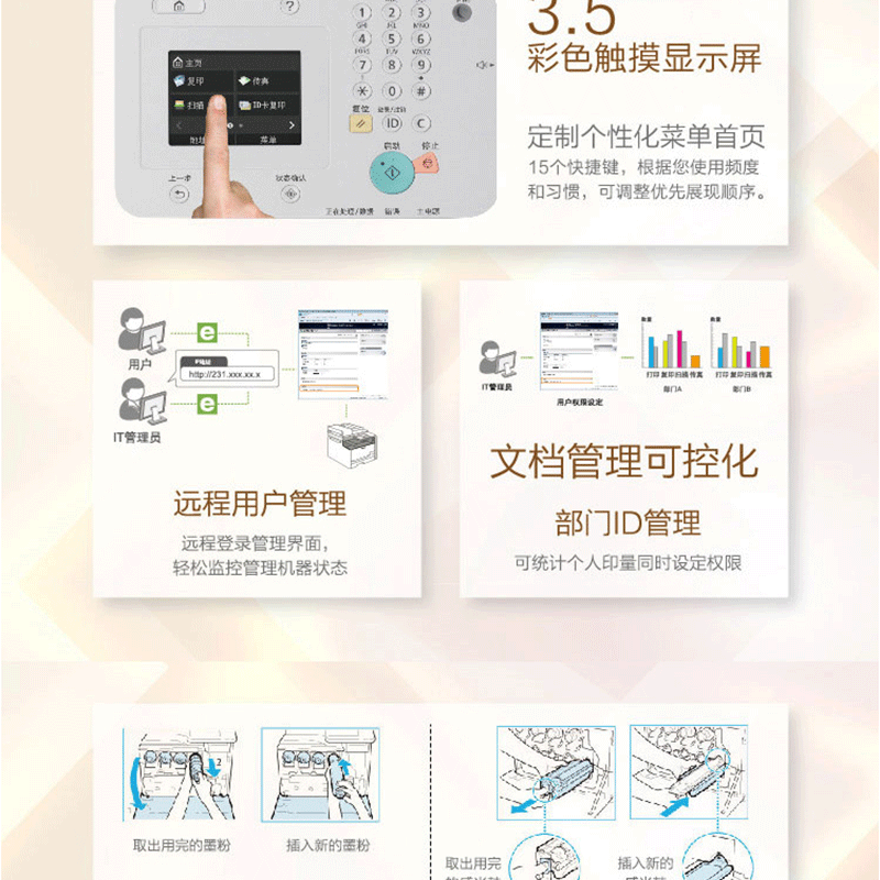 3.5英寸彩色觸摸屏,25頁/分鐘彩色黑白同速,50頁雙面自動輸稿器、標(biāo)配網(wǎng)絡(luò)打印掃描功能 ?