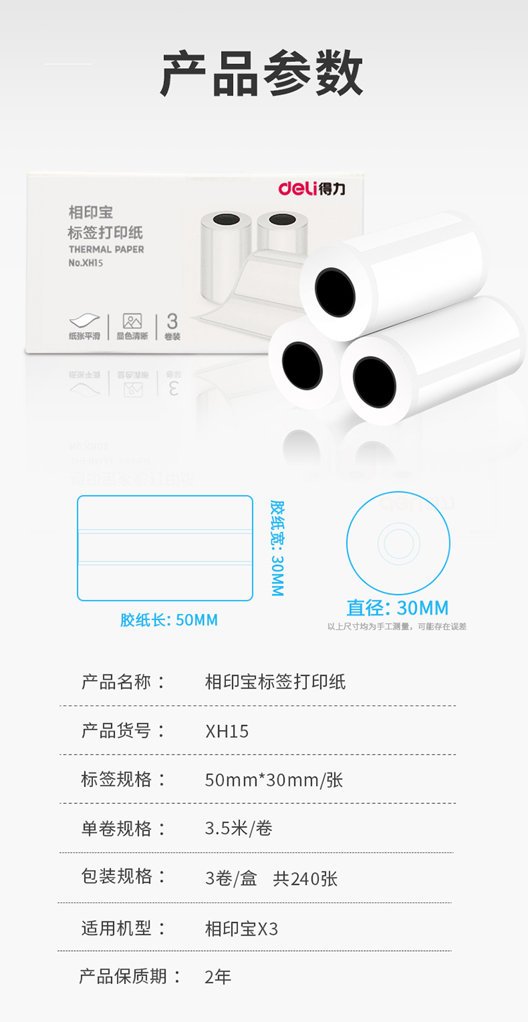 得力(deli) XH15 熱敏打印紙50*30mm 3卷/盒(3.5米/卷)