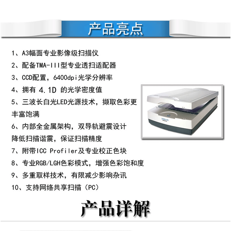 CT片X光片掃描 瓷磚印刷品掃描 高精度掃描,分辨率:6400×9600dpi,圖像傳感器:三線CCD/動(dòng)態(tài)密度 4.1Dmax ?