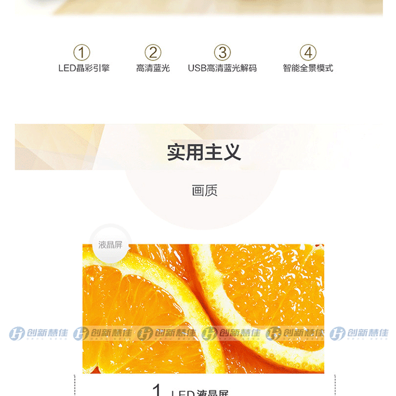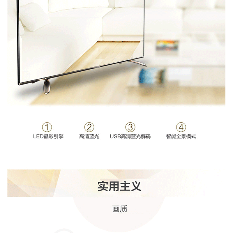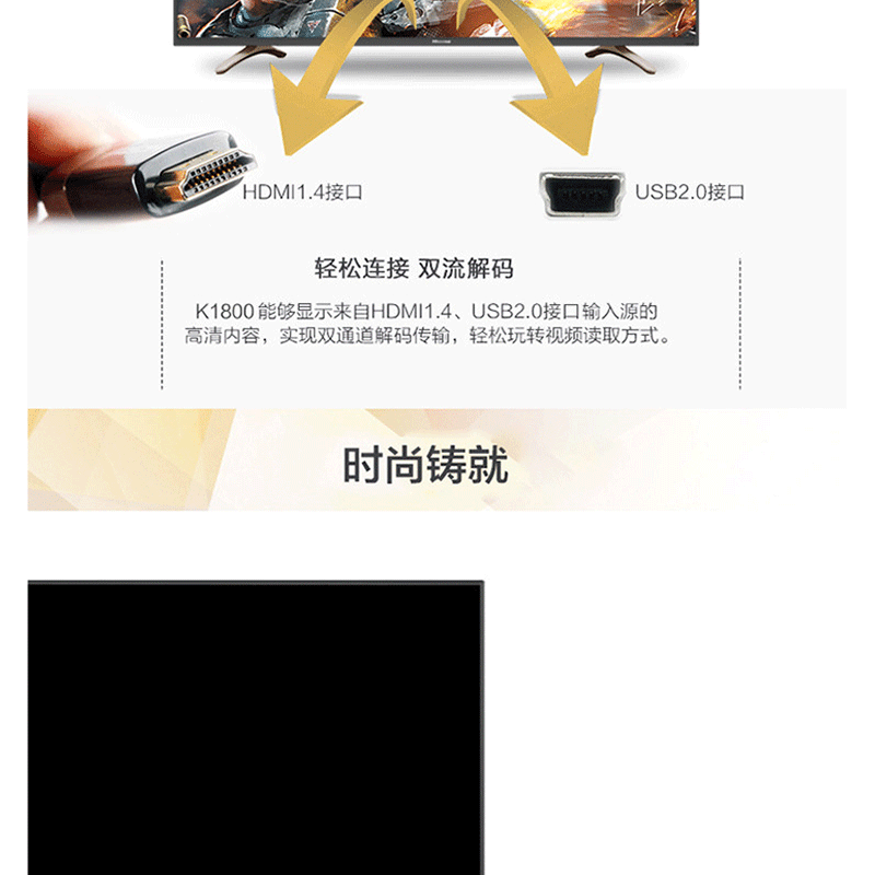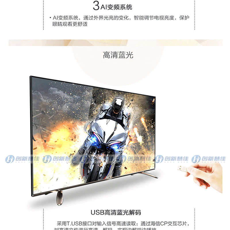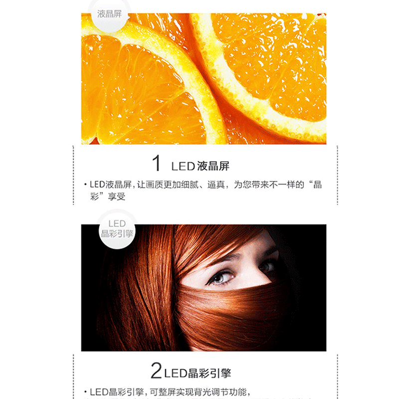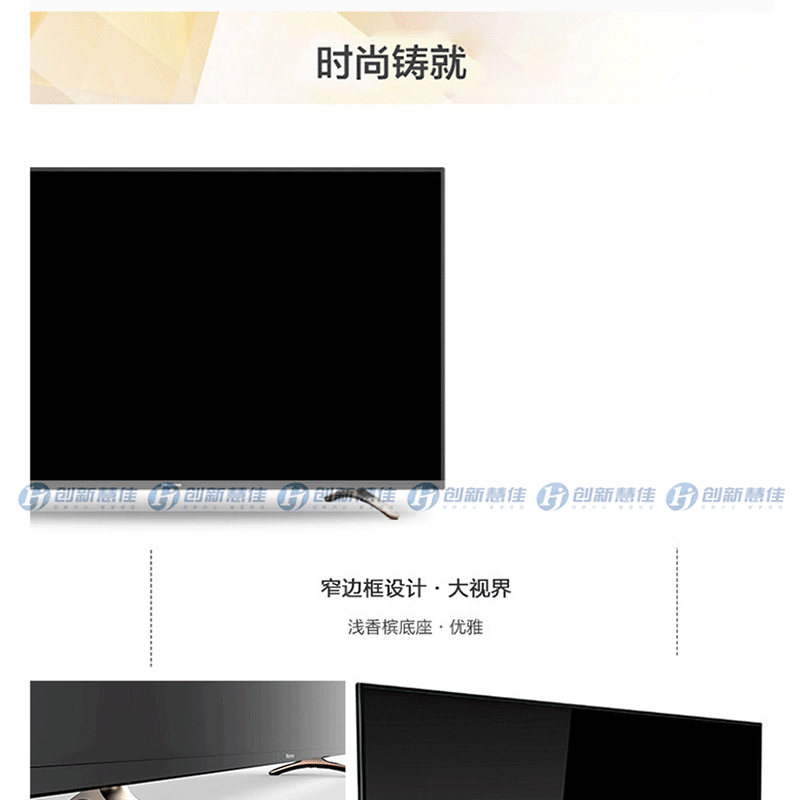 全程高清解碼、藍(lán)光解碼,極窄邊框無限視界、黑色高光注塑工藝、 淺色香檳底座、一體化后殼設(shè)計,立體變頻、圖像分析 ?