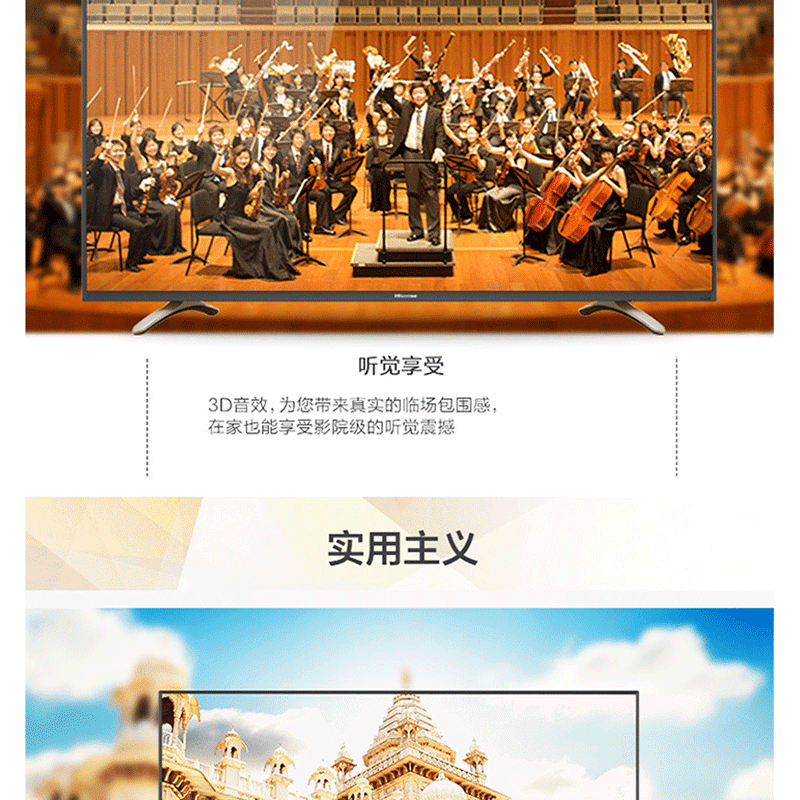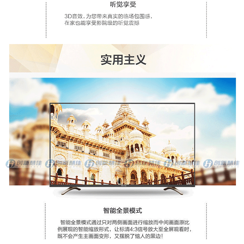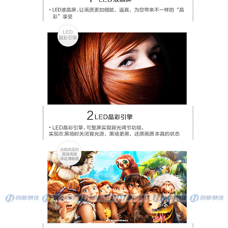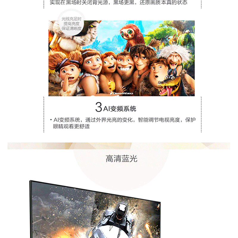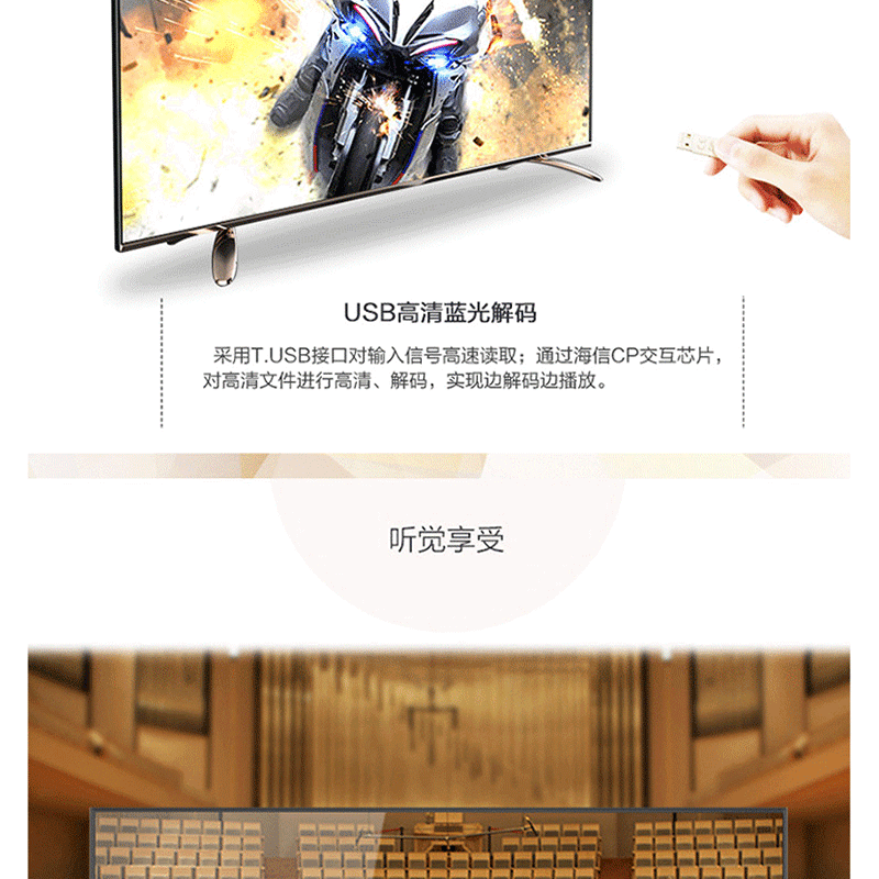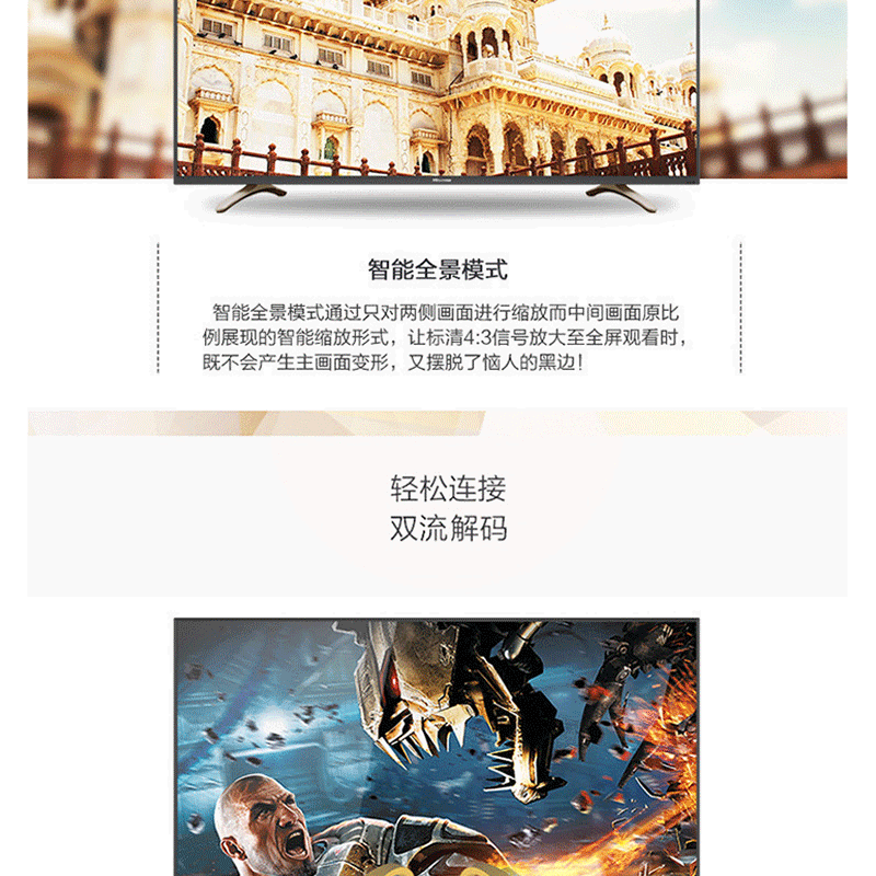 全程高清解碼、藍(lán)光解碼,極窄邊框無限視界、黑色高光注塑工藝、 淺色香檳底座、一體化后殼設(shè)計,立體變頻、圖像分析 ?