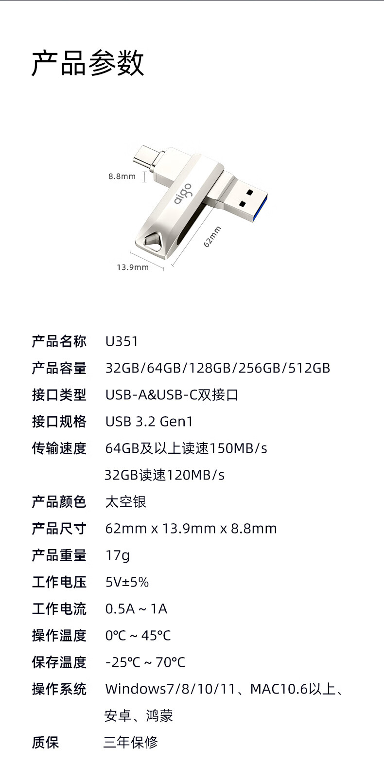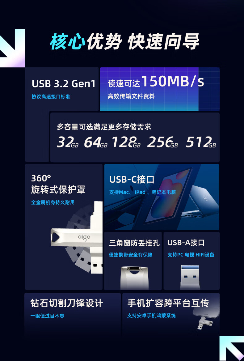 愛國者(aigo)512GB Type-C USB3.2 U盤 U351