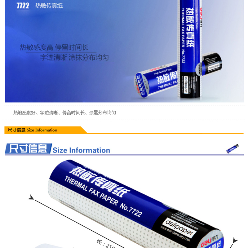 得力(deli) 7722 熱敏傳真紙(白)216mm*29m(卷)12卷裝