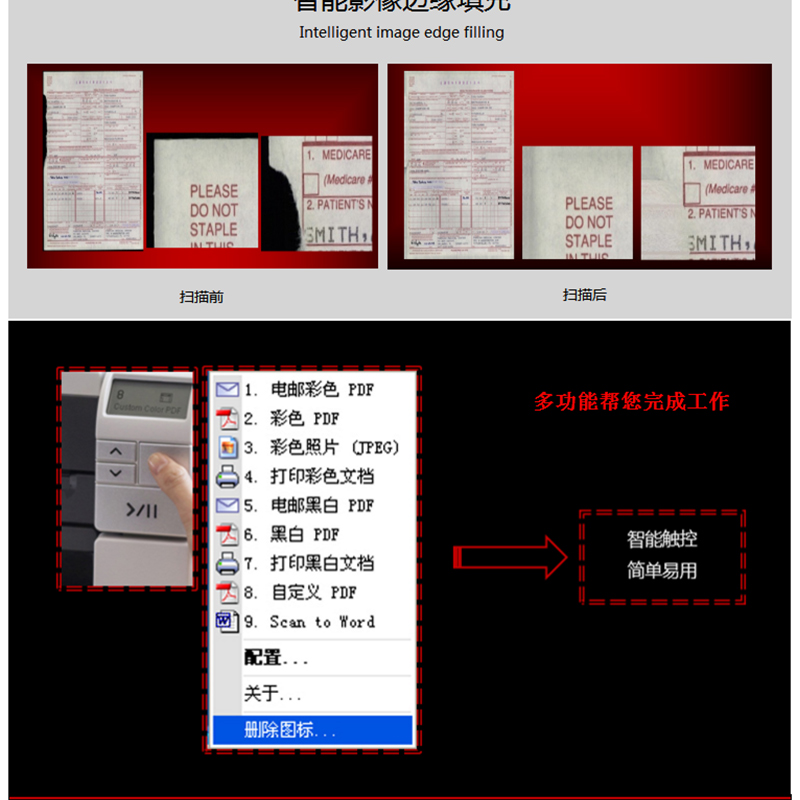 掃描速度:50頁/分鐘,可掃文件,發(fā)票,硬卡,浮雕卡,身份證等 ?