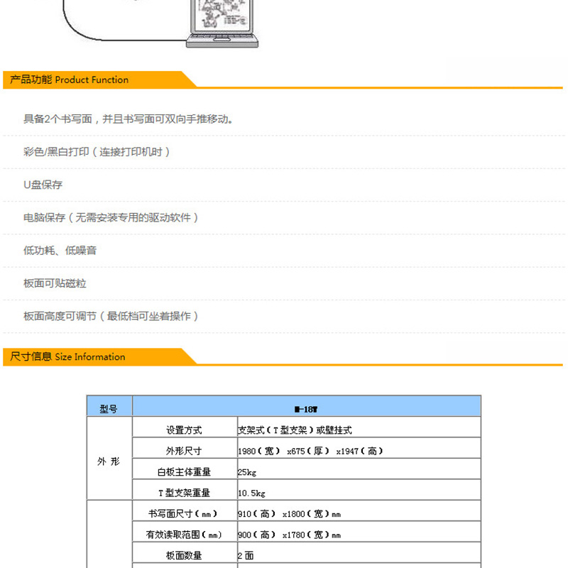 書寫面積:910x1800mm(雙面),彩色打印,U盤存儲(chǔ),USB插槽,板面可貼磁粒,雙向手推/電動(dòng) ?