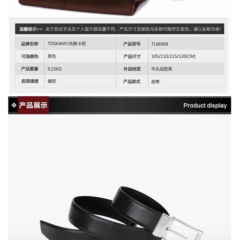 托斯卡尼(TOSKANY) TL66968 男士針扣牛皮商務(wù)皮帶/腰帶 黑色