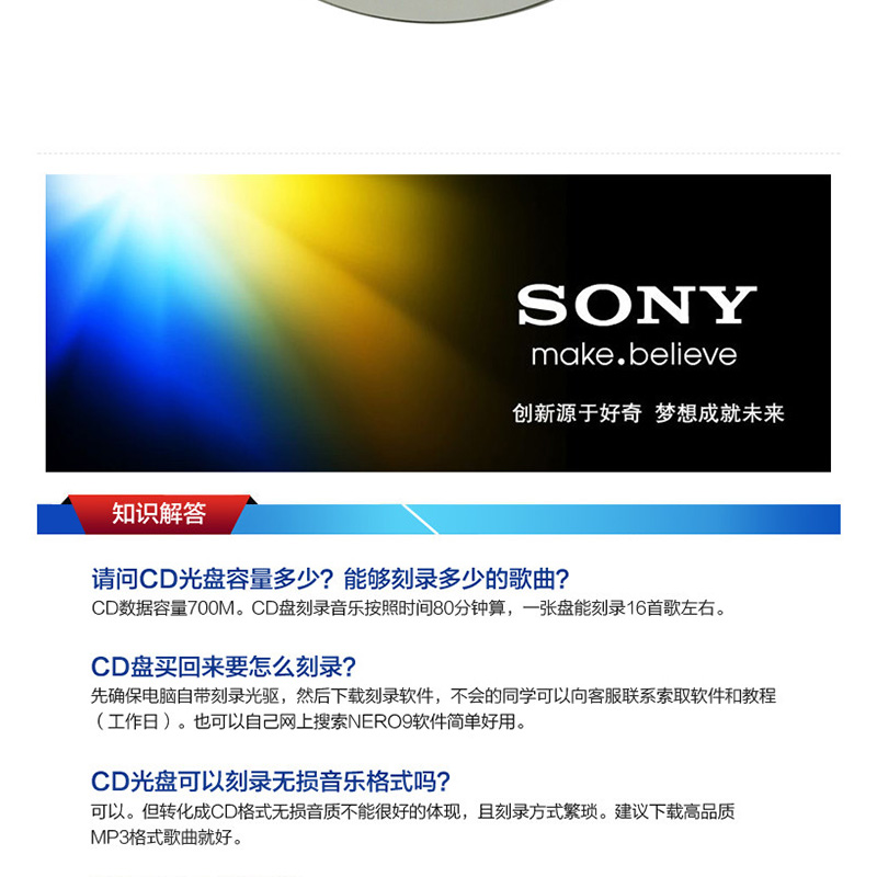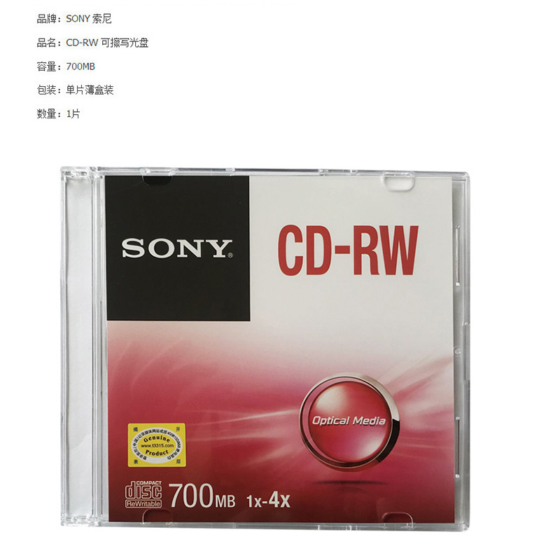 索尼(SONY) CD-RW 光盤/刻錄盤 1-4速700MB 單片盒裝 可擦寫 空白光盤(十盤裝的包裝不一樣) 10盒/包