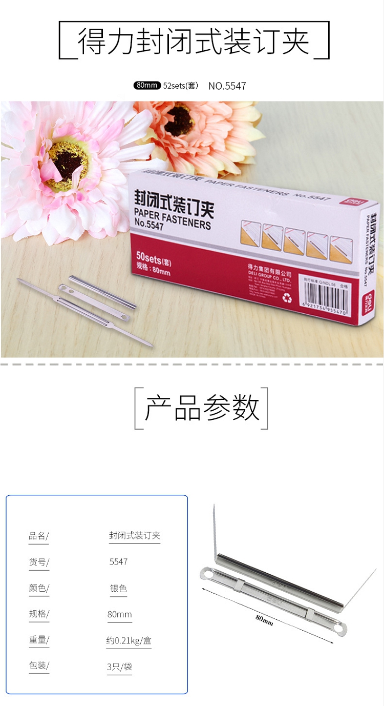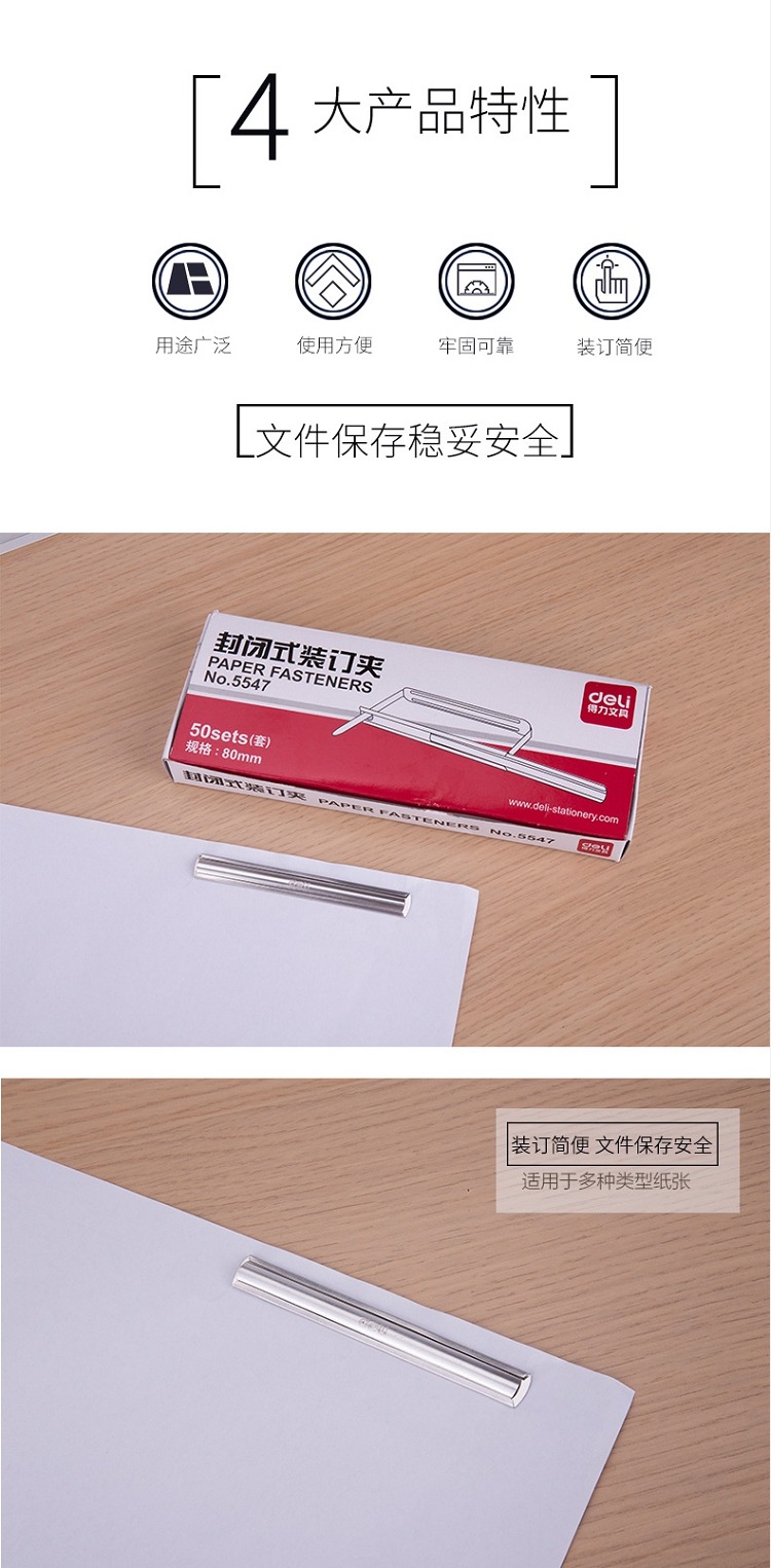 得力(deli) 5547 80mm 封閉式金屬裝訂夾 50套/盒