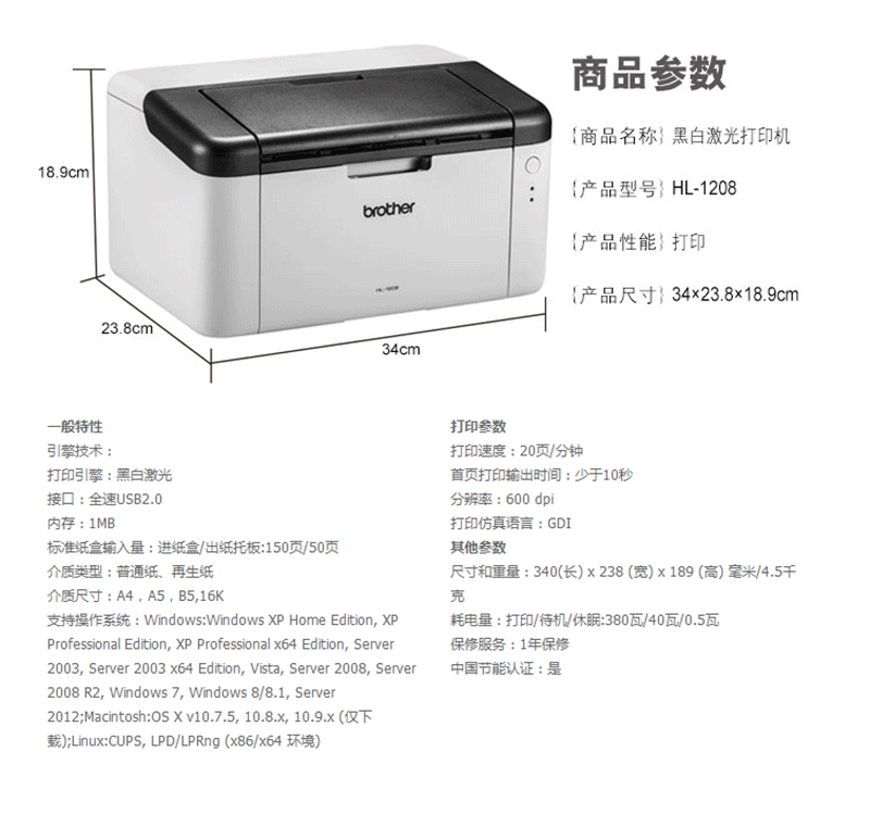 兄弟(brother) HL-1208 黑白激光打印機(jī)