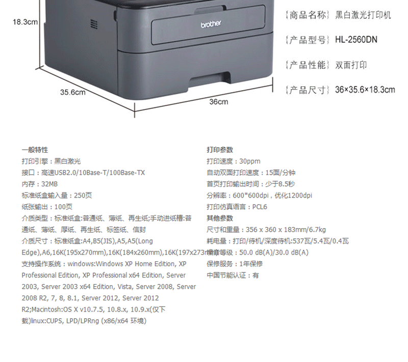 兄弟(brother) HL-2560DN 黑白激光打印機(jī)(有線網(wǎng)絡(luò) 雙面打印)