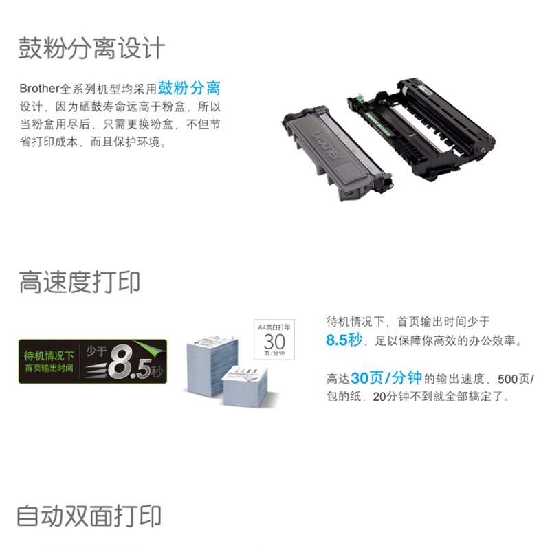 30頁/分鐘高速打印,15面/分鐘雙面打印,節(jié)約打印成本! ?