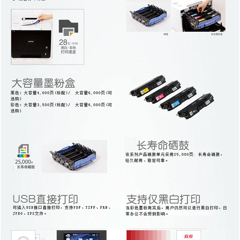 自動雙面 網(wǎng)絡(luò)打印 A4打印幅面!單面28頁/分鐘,雙面14面/分鐘,大容量墨粉盒! ?